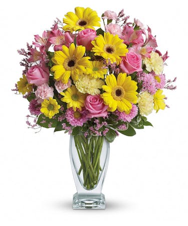 Dazzle someone special with a stylish and bright bouquet! These delightful blossoms in shades of pink and yellow are delivered in a gorgeous glass vase.
