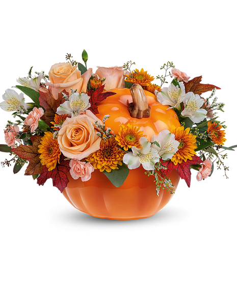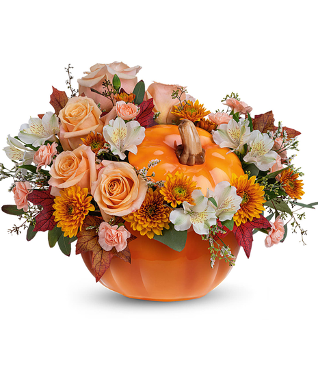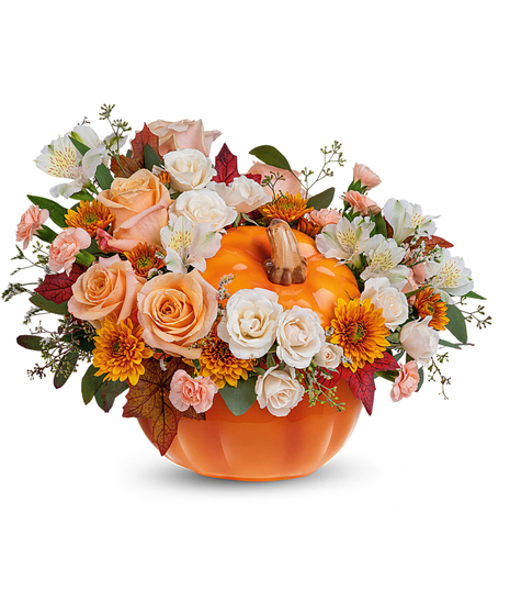 Welcome fall into your home with this warm and cozy, Hello Pumpkin arrangement. The autumnal mix will add a sophisticated touch with crème roses combined with the warm hues of bronze chrysanthemums and peach mini carnations! Pumpkin has no lid but we will add a fun fall element to the design.