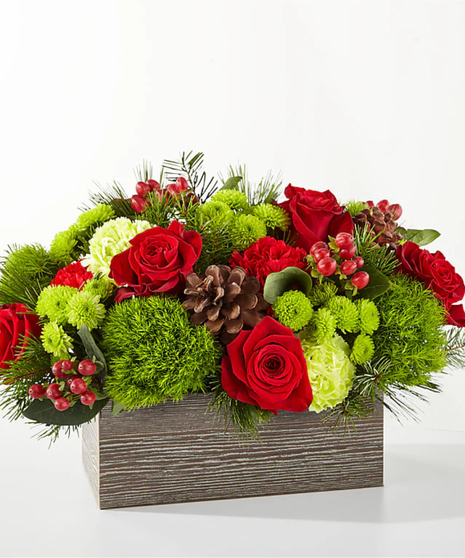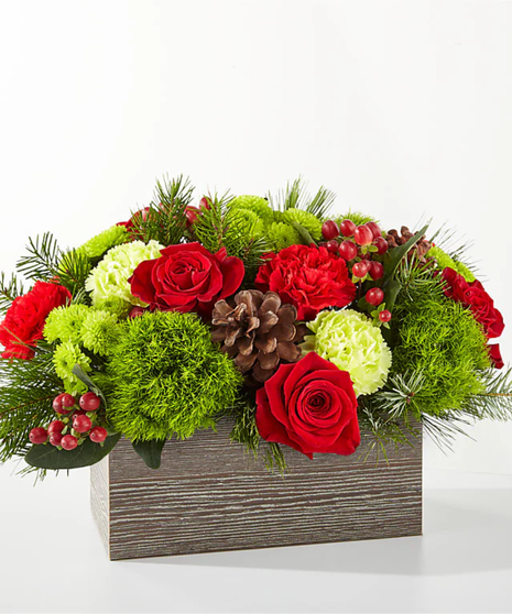 Celebrate the season with this festive arrangement! Perfect for holiday parties, or simply sending your best winter wishes, this lush bouquet is trimmed with glistening mesh ribbon and shimmering green ornament balls.