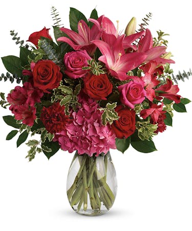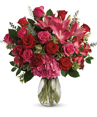 A luxurious bouquet that's sure to leave your special someone absolutely love struck! There's no denying the dramatic beauty of these radiant, red hot roses, hydrangea and lilies.