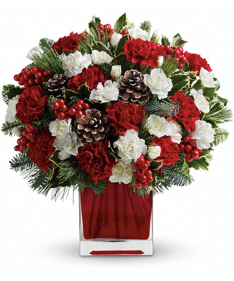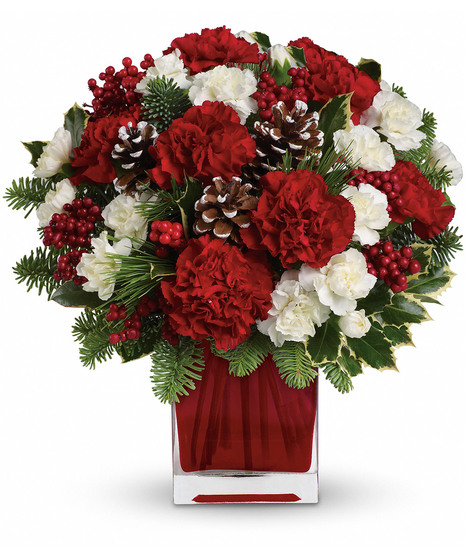 Deliver a winter's day delight. This sweet bouquet includes red carnations and white carnations beautifully arranged in our bright red glass cube.