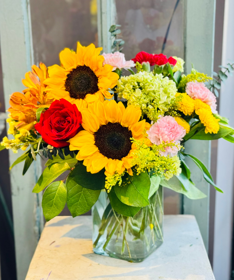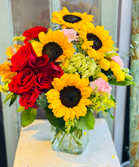 Life will be a picnic for whoever's lucky to receive this gift. It's a lovely vase chock full of fabulous flowers. Roses are a timeless symbol of love and appreciation, and sunflowers are cheerful and bright flowers that will bring a smile to anyone's face—designed with blooms friendly for homes with pets.