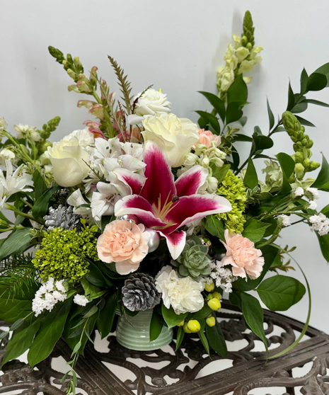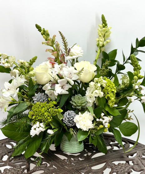 When you really want to make a grand impression on someone special, choose this regal arrangement. Roses, in every possible shade of white, are so beautifully arranged in an exclusive, perfect modern sage green pedestal Glass Bowl; there's no doubt you'll be treated like royalty when you send it! Make it a premium and add perfect stargazer lillies!