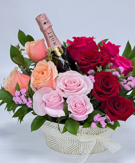 Vibrant purple, deep red, and hot pink roses are a standout combination for just about any special occasion. Our roses are paired with a mini bottle of Moet, artfully arranged with architectural design and tropical greens.