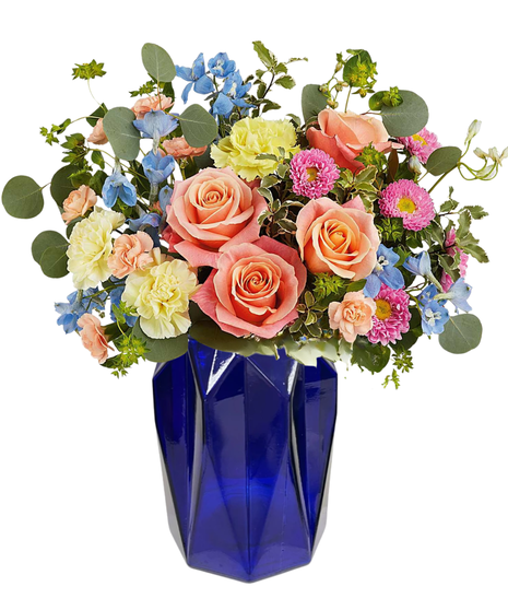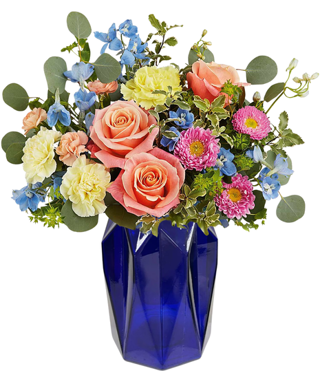 Their heart will dance like a hummingbird when this enchanting floral gift arrives, featuring colorful blooms in a keepsake blue glass vase adorned with pretty vintage garden style flowers.