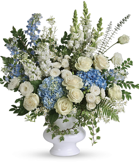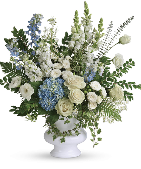A treasured tribute to your beloved, this gorgeously grand bouquet of soft blue hydrangea and pure white roses is reminiscent of a clear sky, a hopeful reminder of life and love. This beautiful bouquet of light blue hydrangea, white roses, white spray roses, white lisianthus, light blue delphinium, white snapdragons, white stock, and white waxflower is accented with huckleberry, variegated ivy, spiral eucalyptus, dagger fern, and lemon leaf. Delivered in a white designer urn.