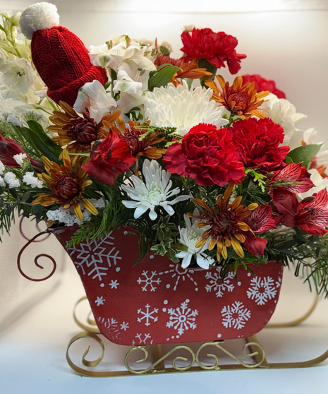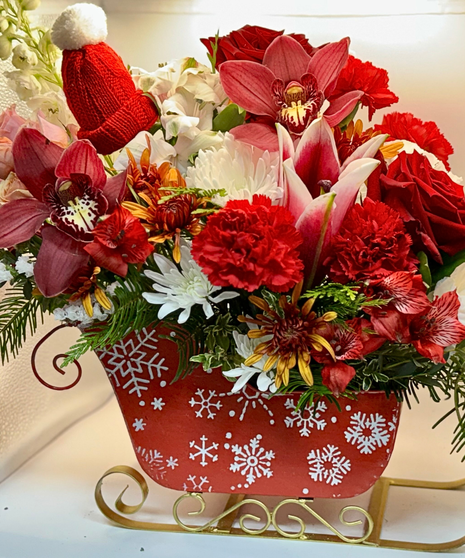 Send holiday cheer in the form of a festive holiday arrangement with an assortment of white and red flowers accented with brown hues in a hand-painted metal sleigh. A Metal 'Santa's Sleigh' holds an adorable bouquet of red roses (in deluxe and premium versions only), red carnations, white days poms and white alstroemeria. Flowers are accented with holiday greenery and a cute Santa's hat and decor.